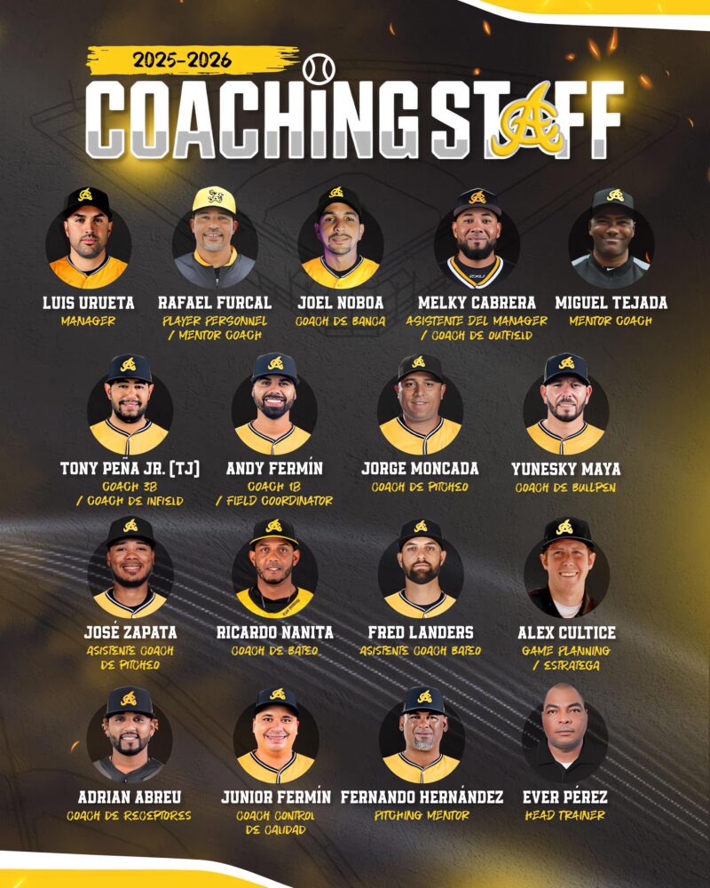 El staff de coaches de las Águilas Cibaeñas para la temporada 2025-2026 estará liderado por el experimentado dirigente colombiano Luis “Pipe” Urueta, quien aporta una sólida trayectoria en el béisbol profesional.