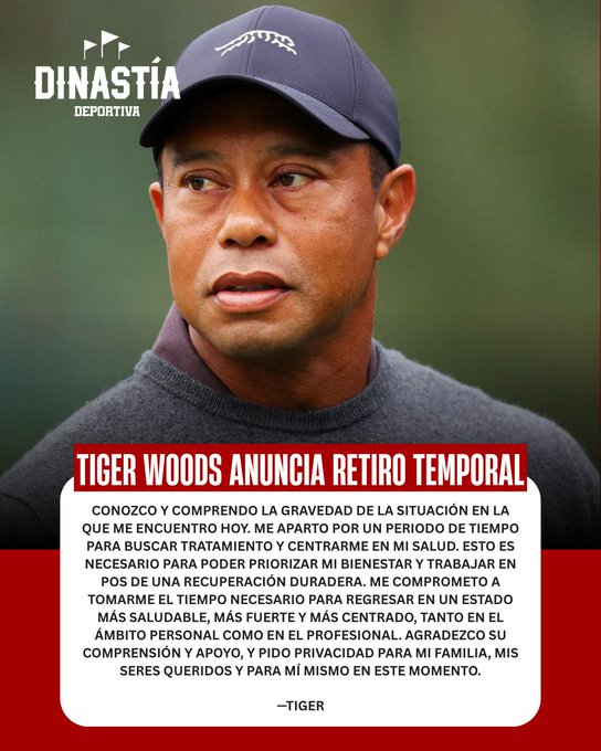 “Esto es necesario para que pueda priorizar mi bienestar y trabajar hacia una recuperación duradera”, dijo Woods en redes sociales.
