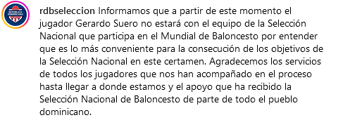Luego de unos días de especulaciones y rumores que indicaban que Gerardo Suero había tenido inconvenientes con el dirigente Ernesto – Che – García, finalmente la Selección Dominicana de Baloncesto declaró en sus redes sociales que el jugador había sido apartado del equipo en el Mundial de Baloncesto 2023.