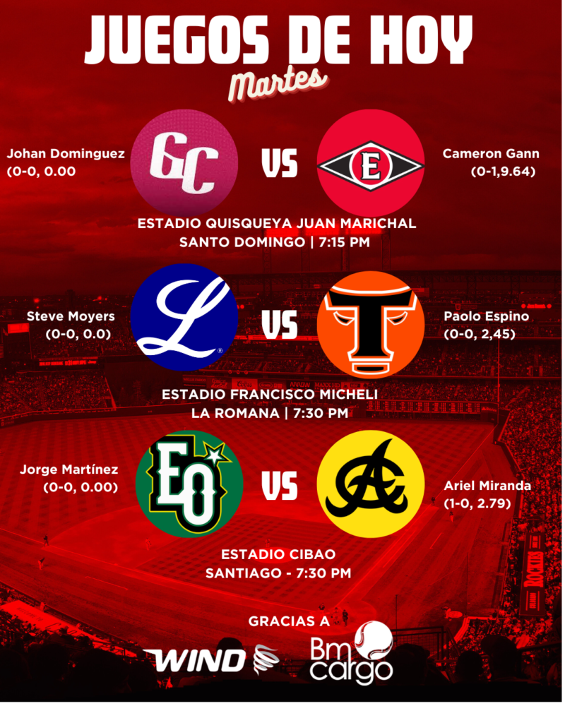 Partidos y lanzadores anunciados para este martes en LIDOM 31 octubre, 2023 Escrito por: Víctor Báez Cuota FacebookTwitterWhatsApp Actividad completa este martes en LIDOM, con partidos en Santo Domingo, La Romana y Santiago. Comparte esto: Compartir en X (Se abre en una ventana nueva) X Comparte en Facebook (Se abre en una ventana nueva) Facebook Compartir en WhatsApp (Se abre en una ventana nueva) WhatsApp Enviar un enlace a un amigo por correo electrónico (Se abre en una ventana nueva) Correo electrónico Me gusta esto:Me gusta Cargando... Relacionado Etiquetasabridor aguilas cibaenasabridor estrellas orientalesabridor gigantes del cibaoabridor leones del escogidoabridor tigres del liceyabridor toros del estebeisbol invernal dominicanolanzadores de hoy lidompartidos de hoy lidom Víctor Báez Más Recientes LNB: Metros vencen a los Soles; Titanes se imponen a Héroes de Moca Baloncesto 17 abril, 2026 LIV Golf dice que el circuito seguirá pese a informes de incertidumbre de fondos saudíes Otros 17 abril, 2026 Abogado de Tiger Woods combatirá orden judicial por recetas médicas Otros 17 abril, 2026 Dominicanos destacados, resultados y highlights del jueves en Grandes Ligas Beisbol 17 abril, 2026 Efemérides: Esto pasó un día como hoy, 17 de abril Efemérides 17 abril, 2026 Artículo anteriorGigantes dejan en el terreno al Escogido para su 5ª victoria consecutivaArtículo siguienteQué está pasando y qué deben hacer los Leones del Escogido? DEJA UNA RESPUESTA Cancelar respuesta Comentario: Por favor ingrese su comentario! Nombre:* Por favor ingrese su nombre aquí Correo electrónico:* ¡Has introducido una dirección de correo electrónico incorrecta! Por favor ingrese su dirección de correo electrónico aquí Sitio web: Guardar mi nombre, correo electrónico y sitio web en este navegador la próxima vez que comente. Recibir un correo electrónico con los siguientes comentarios a esta entrada. Recibir un correo electrónico con cada nueva entrada. Δ
