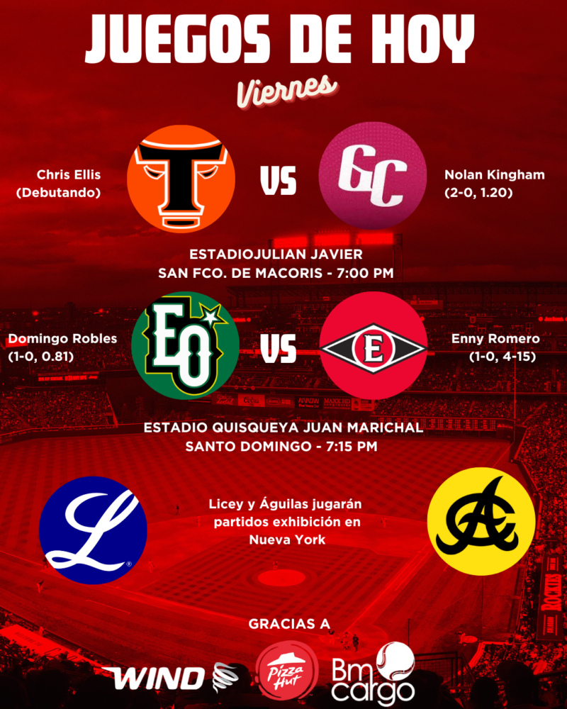 Partidos en San Francisco de Macorís y Santo Domingo este viernes, mientras que Licey y Aguilas jugarán el primero de tres partidos de exhibición en el Citi Field de Nueva York.