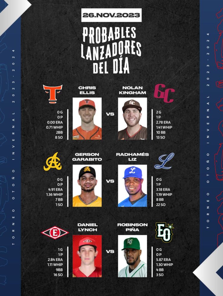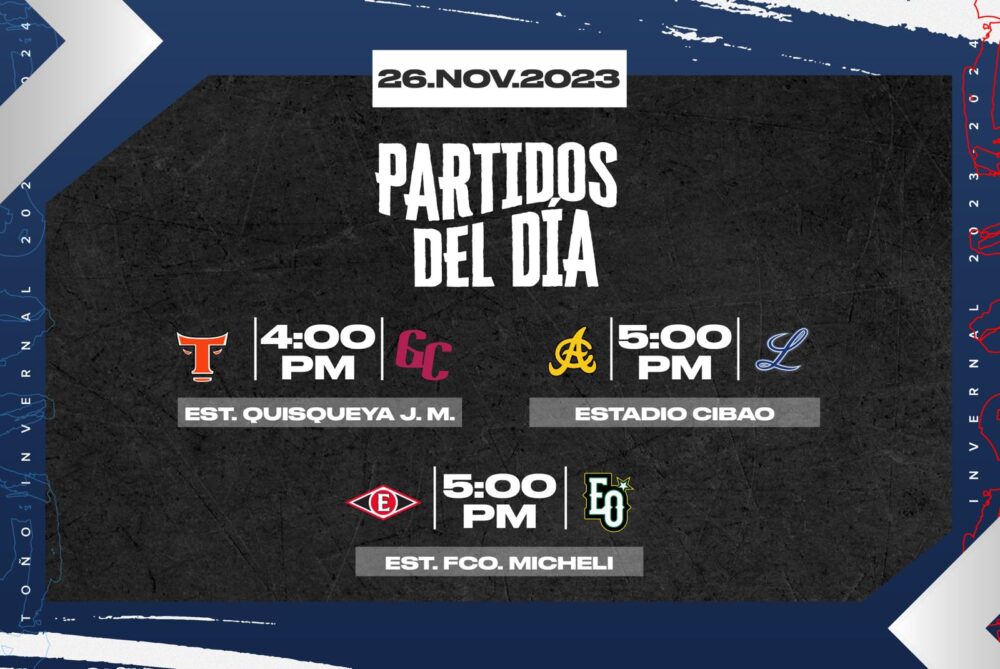 Partidos y lanzadores de este domingo en LIDOM 26 noviembre, 2023 Escrito por: Víctor Báez Cuota FacebookTwitterWhatsApp Comparte esto: Compartir en X (Se abre en una ventana nueva) X Comparte en Facebook (Se abre en una ventana nueva) Facebook Compartir en WhatsApp (Se abre en una ventana nueva) WhatsApp Enviar un enlace a un amigo por correo electrónico (Se abre en una ventana nueva) Correo electrónico Me gusta esto:Me gusta Cargando... Relacionado Etiquetasabridor aguilas cibaenasabridor estrellas orientalesabridor gigantes del cibaoabridor leones del escogidoabridor tigres del liceyabridor toros del estebeisbol invernal dominicanolanzadores de hoy lidompartidos de hoy lidom Víctor Báez Más Recientes Efemérides: Esto pasó un día como hoy, 18 de abril Efemérides 18 abril, 2026 LNB: Metros vencen a los Soles; Titanes se imponen a Héroes de Moca Baloncesto 17 abril, 2026 LIV Golf dice que el circuito seguirá pese a informes de incertidumbre de fondos saudíes Otros 17 abril, 2026 Abogado de Tiger Woods combatirá orden judicial por recetas médicas Otros 17 abril, 2026 Dominicanos destacados, resultados y highlights del jueves en Grandes Ligas Beisbol 17 abril, 2026 Artículo anteriorTito Polo y Michael Mariot vienen a reforzar a los TorosArtículo siguienteEl zurdo Aaron Brown regresa como refuerzo del Licey DEJA UNA RESPUESTA Cancelar respuesta Comentario: Por favor ingrese su comentario! Nombre:* Por favor ingrese su nombre aquí Correo electrónico:* ¡Has introducido una dirección de correo electrónico incorrecta! Por favor ingrese su dirección de correo electrónico aquí Sitio web: Guardar mi nombre, correo electrónico y sitio web en este navegador la próxima vez que comente. Recibir un correo electrónico con los siguientes comentarios a esta entrada. Recibir un correo electrónico con cada nueva entrada. Δ
