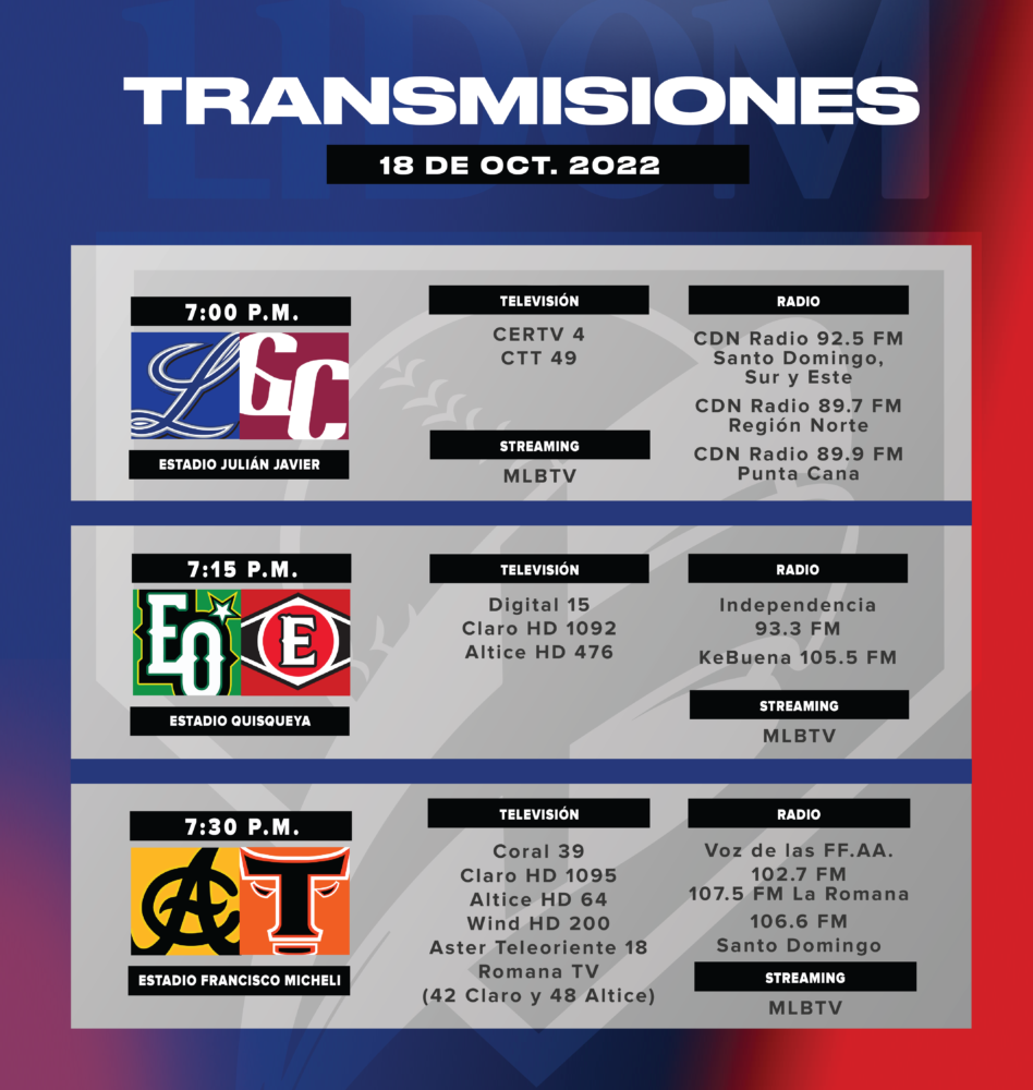 La cuarta fecha de LIDOM presenta partidos en San Francisco de Macorís, Santo Domingo y La Romana.