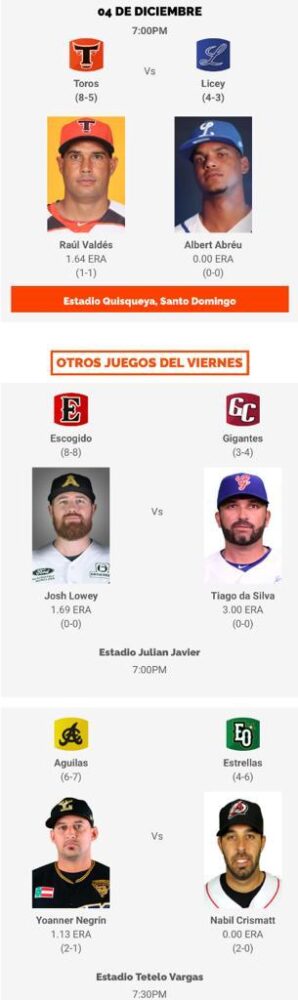 Partidos y lanzadores de este viernes en LIDOM 4 diciembre, 2020 Escrito por: Víctor Báez Cuota FacebookTwitterWhatsApp Comparte esto: Compartir en X (Se abre en una ventana nueva) X Comparte en Facebook (Se abre en una ventana nueva) Facebook Compartir en WhatsApp (Se abre en una ventana nueva) WhatsApp Enviar un enlace a un amigo por correo electrónico (Se abre en una ventana nueva) Correo electrónico Me gusta esto:Me gusta Cargando... Relacionado Víctor Báez Más Recientes Filis despiden a Rob Thomson; Don Mattingly será el manager interino Beisbol 28 abril, 2026 Estrellas firman a agente libre Jesús Valdez LIDOM 28 abril, 2026 Dominicanos destacados, resultados y highlights del lunes en Grandes Ligas Beisbol 28 abril, 2026 Thunder barre a los Soles; Magic y Nuggets a un paso de avanzar Baloncesto 28 abril, 2026 Cooper Flagg gana el Novato del Año de la NBA Baloncesto 27 abril, 2026 Artículo anteriorVIDEO: Pitcheo dominando en lo que va de temporada en LIDOMArtículo siguienteEstrellas Orientales importan lanzadores Otero y Flores DEJA UNA RESPUESTA Cancelar respuesta Comentario: Por favor ingrese su comentario! Nombre:* Por favor ingrese su nombre aquí Correo electrónico:* ¡Has introducido una dirección de correo electrónico incorrecta! Por favor ingrese su dirección de correo electrónico aquí Sitio web: Guardar mi nombre, correo electrónico y sitio web en este navegador la próxima vez que comente. Recibir un correo electrónico con los siguientes comentarios a esta entrada. Recibir un correo electrónico con cada nueva entrada. Δ