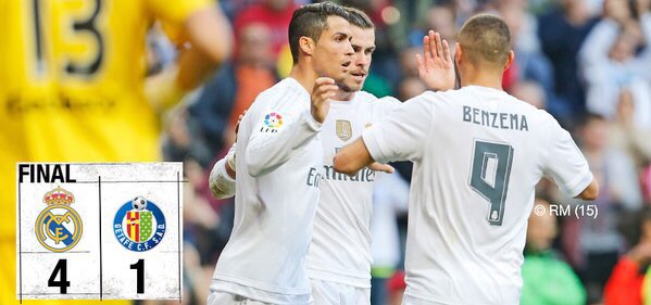 Tras una semana movida que resultó en su sonrojante eliminación de la Copa del Rey, el Real Madrid tomó el sábado vitaminas en la liga española al golear por 4-1 de local al Getafe; una victoria fundamentada en los goles de Karim Benzema, Gareth Bale y Cristiano Ronaldo y que recortó momentáneamente su diferencia en la clasificación respecto al líder Barcelona.