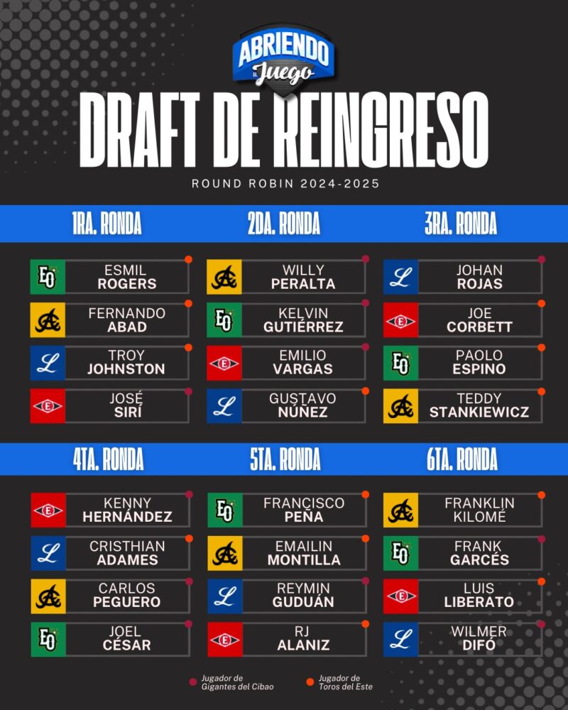 . –El lanzador Esmil Rogers, de los Toros del Este, fue la primera selección, este lunes, del Draft de Reingreso de los equipos eliminados para el Round Robin 2024-25 por las Estrellas Orientales.