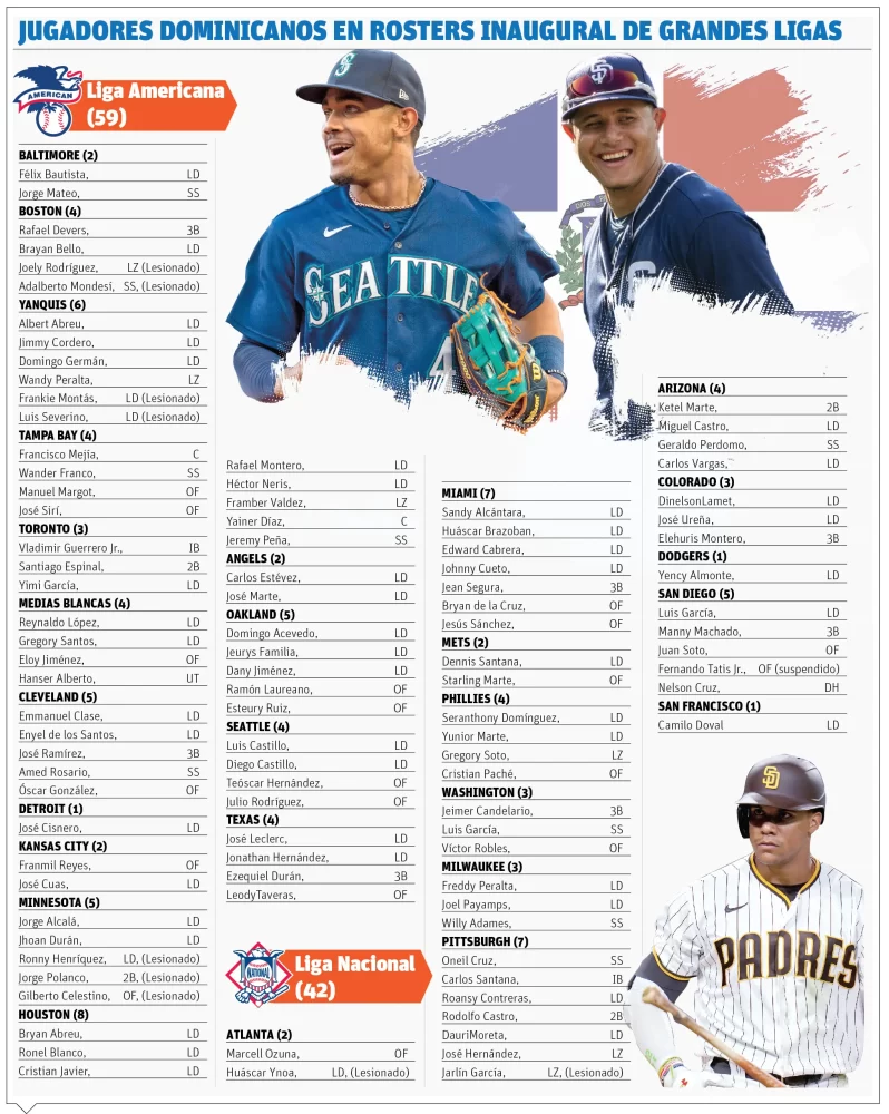 Un total de 102 jugadores dominicanos 60 en la Liga Americana y 42 en la Nacional) estarán en las nóminas de 27 equipos de los 30 para la apertura de hoy en las Grandes Ligas. Aunque en ese grupo se incluyen a nueve que están en la lista de incapacitados y uno suspendido. En el gráfico (fuente: EL DIA) no aparece Jhony Brito, quien iniciará la temporada con los Yankees.