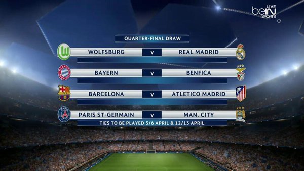 El Real Madrid, por su parte, se verá las caras con el modesto Wolfsburgo alemán. En otro duelo aparentemente desigual, el Bayern de Múnich se medirá al Benfica portugués tras la clasificación in extremis del equipo entrenado por Pep Guardiola el miércoles.