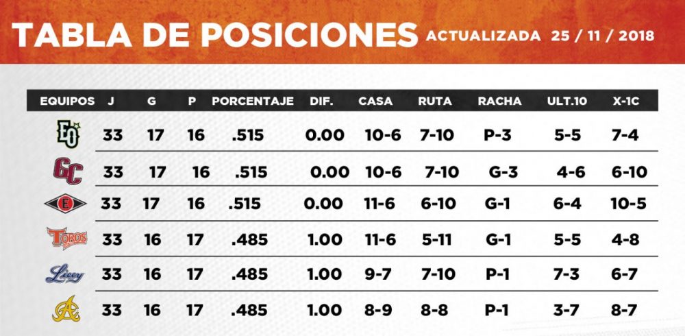 Fue la undécima victoria para los Toros (16-17) como dueños de casa con seis derrotas, que a su vez provocaron un triple empate con Tigres y Águilas Cibaeñas en el segundo lugar de la tabla de posiciones, a un juego de distancia del primer lugar, que también se han adueñados tres equipos, hito histórico, en el béisbol invernal dominicano.